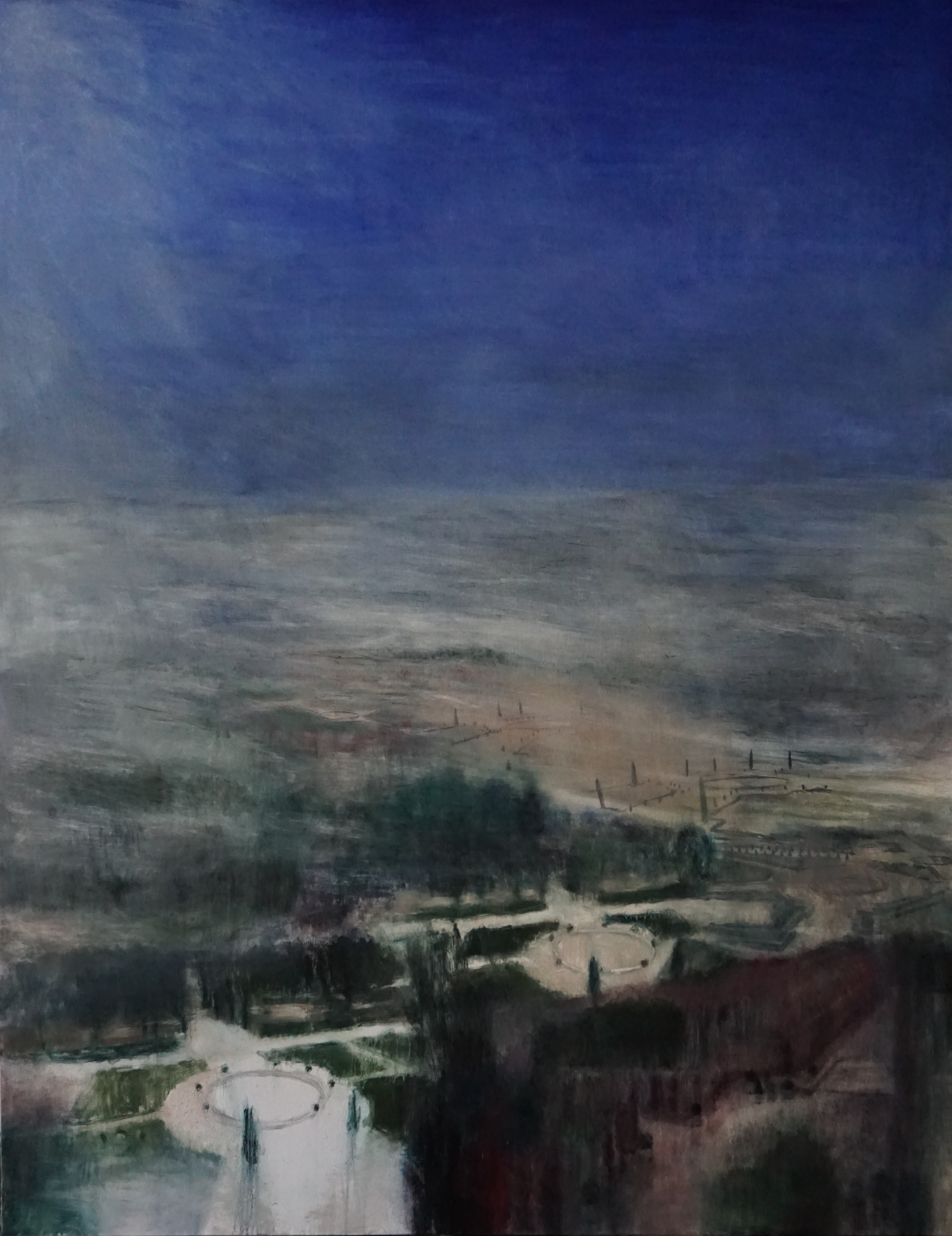 After making pilgrimages to castles and cathedrals across Europe, Stokłosa has trained his eye on royal furnishings that have only managed to survive into our century as museum pieces. His effort as an artist is to return what preservationists explicitly set out to halt: a sense of age, wear, and lost time. No one will ride in the carriage of Napoli (2022) or sit on the fauteuils in The apartments of Napoleon III (2023) ever again, and in drawing attention to their recast role as art objects, Stokłosa reveals how useless these formerly functional have become. In the painting that lends his exhibition its title, Stokłosa fuses a composite of various royal gardens into an achingly beautiful but blurry and unresolved skyline, demonstrating in paint that the past is its own completely different country.